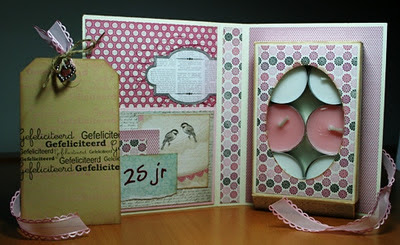 Vrijdag aanstaande hebben wij van onze vakantievrienden een 25-jarig huwelijksfeestje....Uiteraard is de cadeautip de welbekende envelop. Maarja met alleen een envelop kan ik natuurlijk niet aankomen en heb ik na aanleiding van Tineke en via een link van haar, dit theelichtjes doosje gemaakt. Kunnen ze romatisch een kaarsje branden en een leuke manier om alsnog het geld in kwijt te kunnen. Aangezien er nog een heel aantal van onze Spaanse camping komen hebben we er nu al erg veel zin in !!